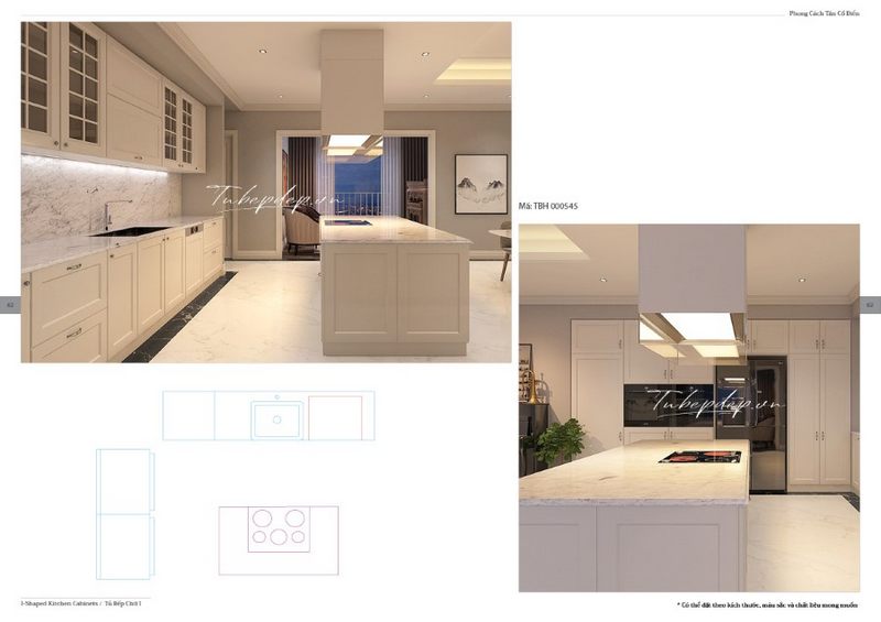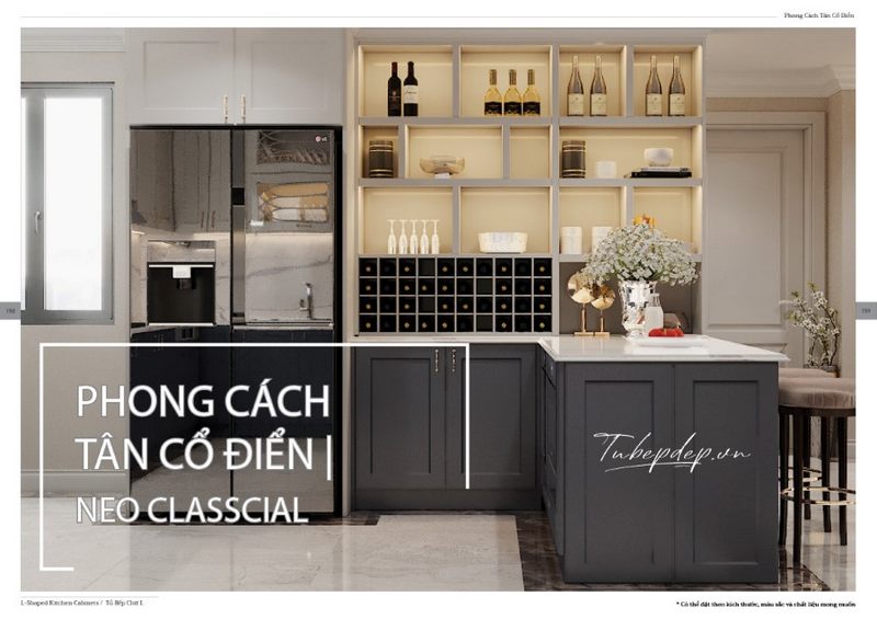 Các căn hộ chung cư cao cấp có không gian bếp liền với phòng khách nên thiết kế nội thất bếp tập trung nhiều vào công năng dù theo phong cách tân cổ điển.Tủ bếp trên kịch trần chia nhiều ngăn tiện lợi đang là xu hướng được ưa chuộng