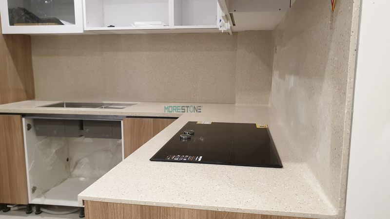Đá ốp mặt bếp đá nhân tạo màu trắng với ưu điểm vượt trội không vết nối bề mặt bằng phẳng thẩm mỹ mang lại cao dễ dàng vệ sinh tiết kiệm thời gian cho người nội trợ hằng ngày