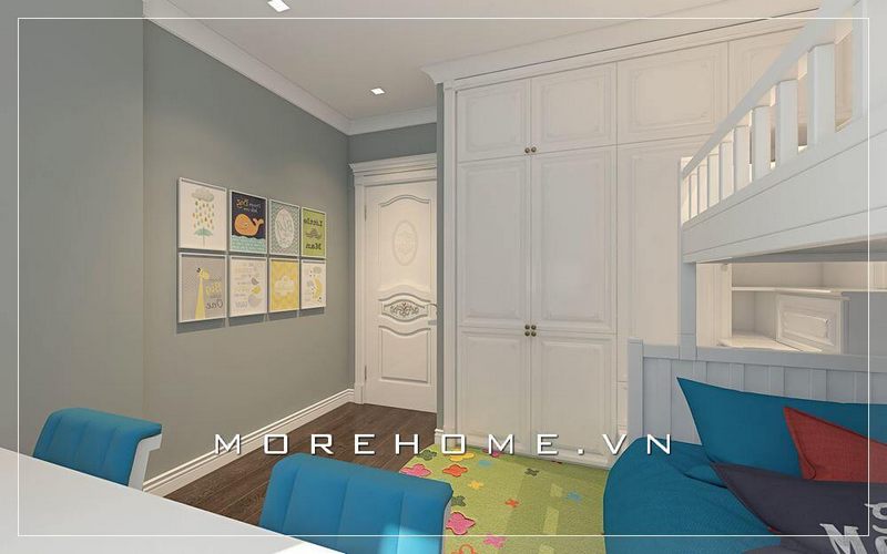 Tủ quần áo gỗ tự nhiên đầy tinh tế và sang trọng được đặt tại phòng ngủ của 2 bé trai.