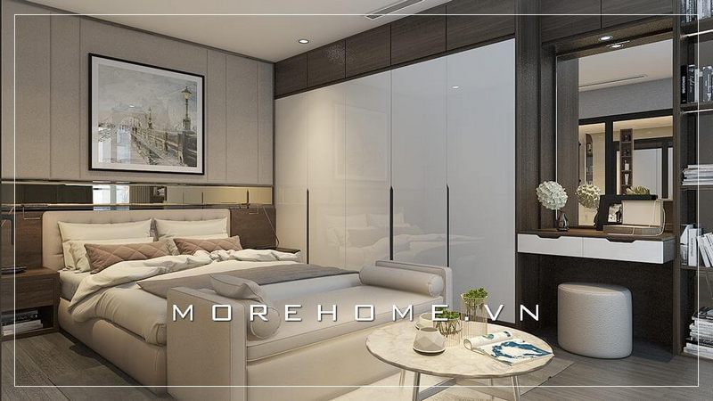 Mẫu tủ quần áo gỗ màu trắng với thiết kế âm tường giúp tạo nên sự sang trọng và tiết kiệm diện tích không gian trong phòng ngủ.