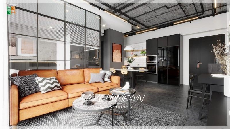 Phòng khách chung cư được ngăn cách với các phòng khác của hộ bằng lớp kính vách ngăn trong suốt tạo độ thoáng cho căn hộ