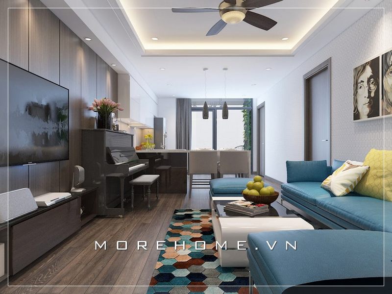 Không gian phòng khách căn hộ được tiết kiệm tối đa với một mẫu sofa kiểu góc tiện lợi và phong cách hiện đại trẻ trung, mang lại một vẻ độc đáo với màu xanh sống động.